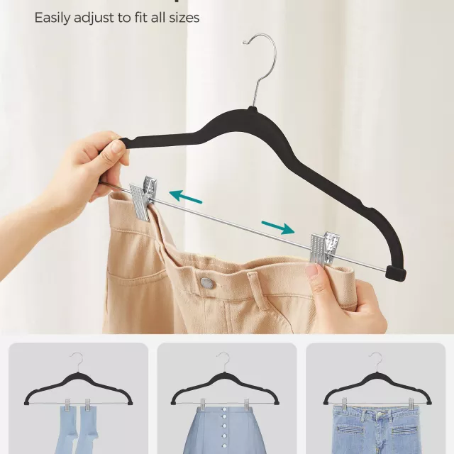 Each hanger is crafted from durable ABS plastic, smooth nylon velvet, and sturdy metal for long-lasting use. The slim profile maximizes closet space, while the 5.5 lb static load capacity supports heavier fabrics with ease. The 16.7-inch width ensures your clothing hangs naturally, reducing wrinkles and keeping items ready to wear. With clips that slide to fit different sizes, you can neatly store everything from wide-leg trousers to kids’ skirts. These hangers deliver practical, everyday reliability for any room where clothing storage matters.